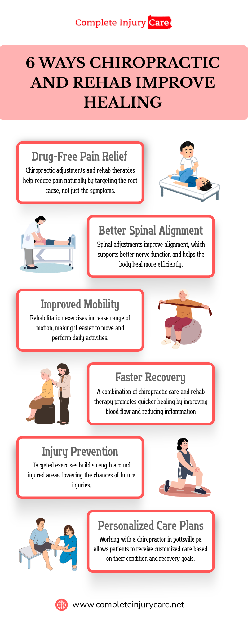 This infographic shows how chiropractic care and rehab support faster healing through pain relief, better alignment, improved mobility, and targeted exercises. A trusted chiropractor in pottsville pa can provide personalized care plans that help the body recover naturally and reduce the risk of future injuries. For effective recovery and professional support, contact Complete Injury Care and get the right treatment plan tailored to your needs.