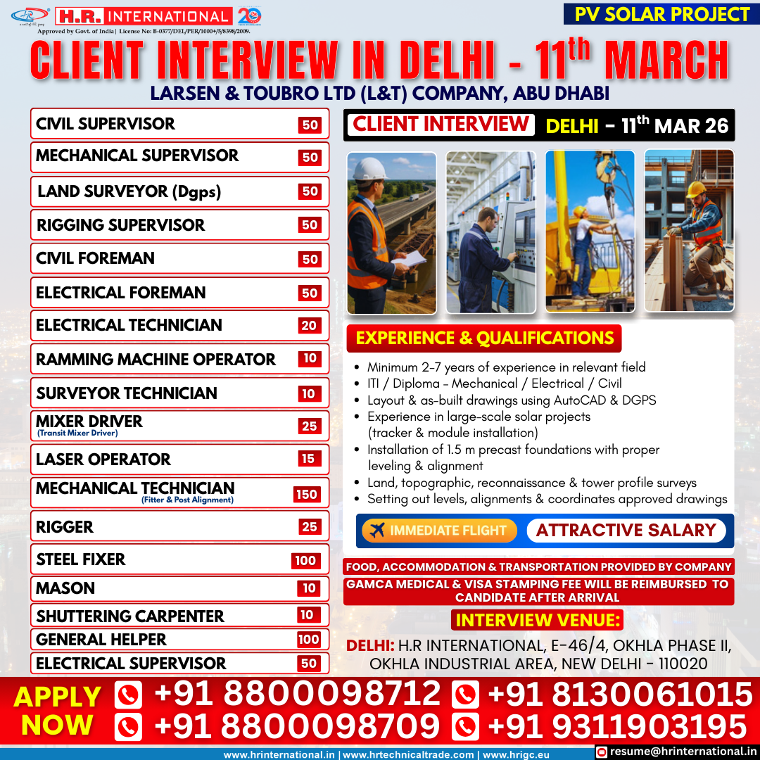 Are you a skilled professional seeking an exciting overseas career opportunity? Donโt miss the PV Solar Project LT Abu Dhabi Client Interview in Delhi on 11th March organized by HR International โ your trusted overseas recruitment partner. This high-impact recruitment event invites experienced candidates to interview directly with Larsen & Toubro (L&T) for large-scale PV solar project roles based in Abu Dhabi, UAE.