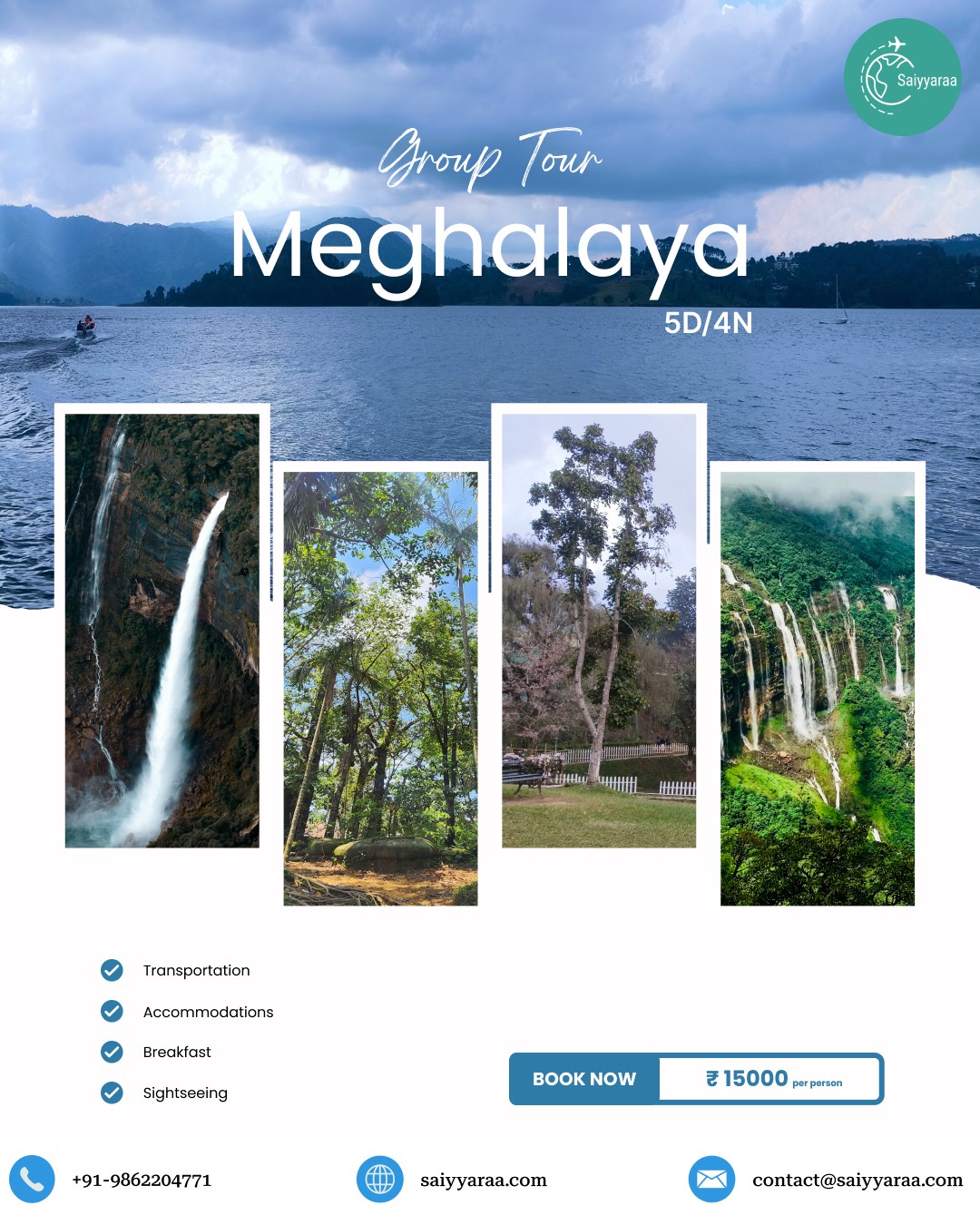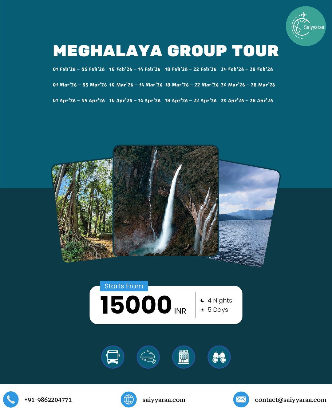 Saiyyaraa Travels brings you a fixed-departure Meghalaya Group Tour covering Shillong, Cherrapunjee & Mawlynnong with planned stays and comfortable transport.
