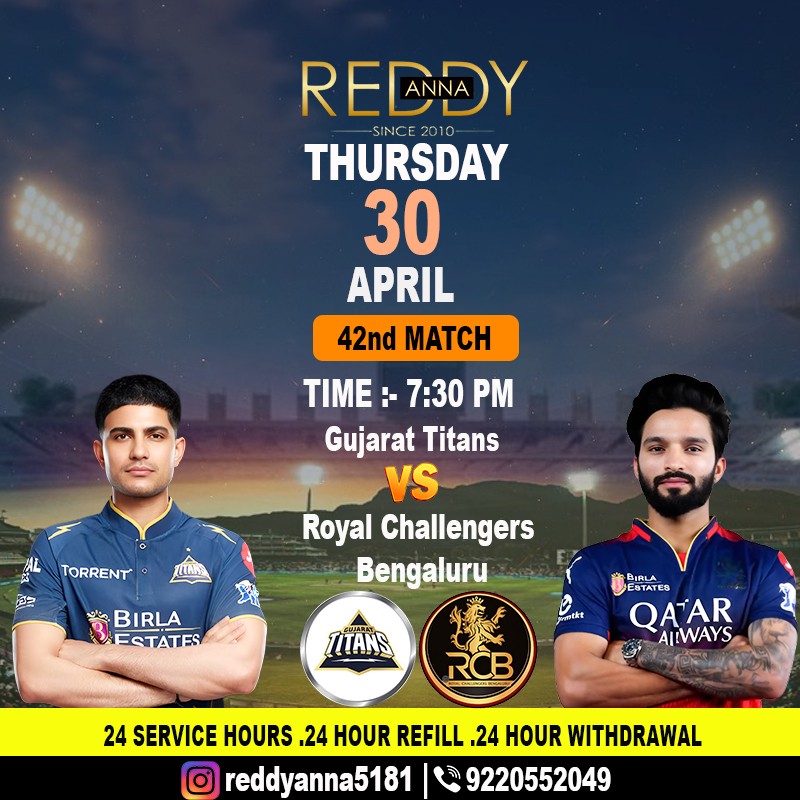 Get set for a thrilling match between the Gujarat Titans and Royal Challengers Bengaluru in the 42nd match of IPL, scheduled to be held today at 7:30 PM in Ahmedabad. Be updated with all the exciting moments from the match through Reddy Anna Book.
