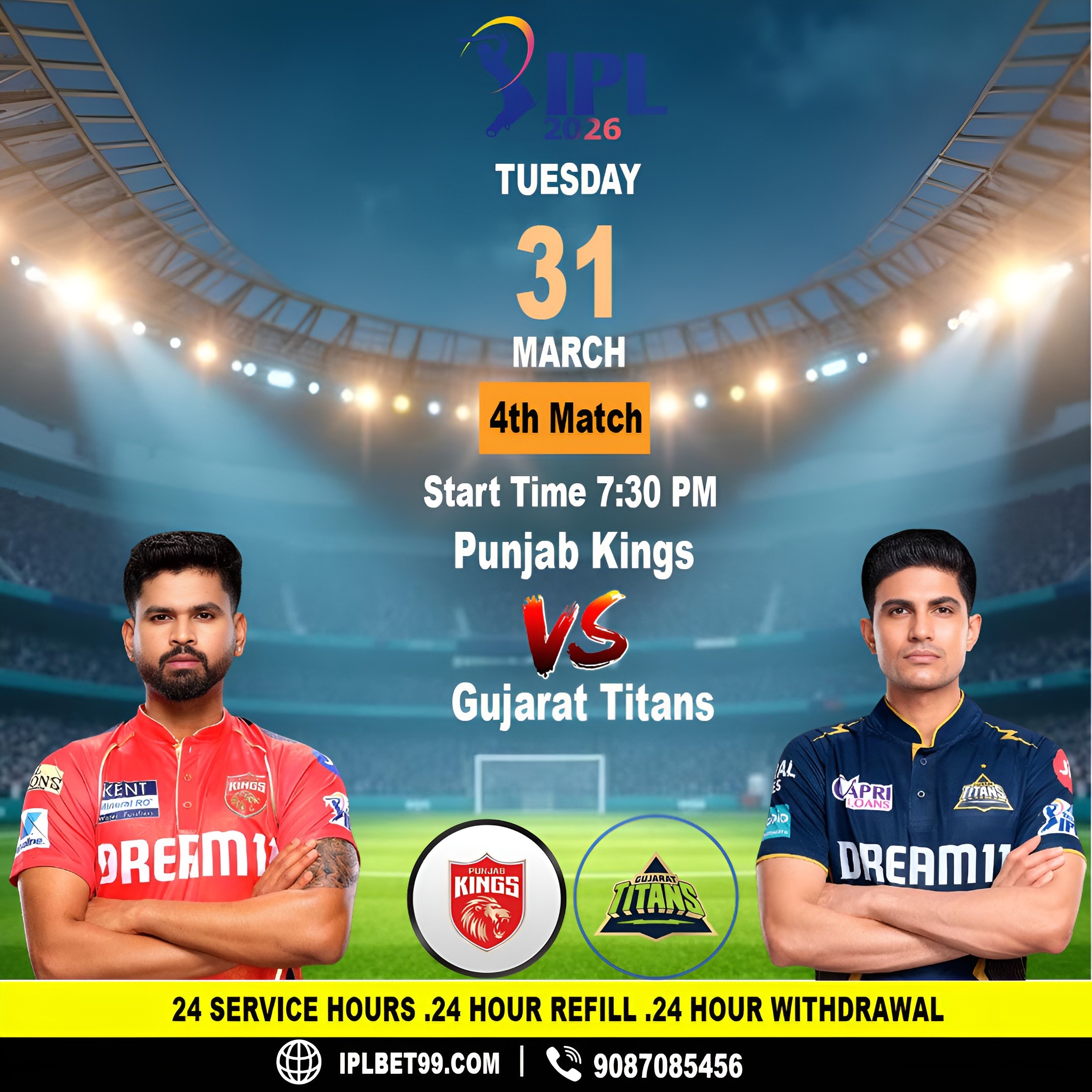 Excited to watch the Diamond Exchange ID Punjab Kings take on the Gujarat Titans in the 4th match of Indian Premier League 2026! 🏏 Join us at Maharaja Yadavindra Singh International Cricket Stadium, Mullanpur, New Chandigarh today at 7:30 PM. #DiamondExchangeId #diamondexchid #DiamondExchange #IPL2026 #punjabkings #GujaratTitans #IPLUpdates #IPLAction #IPLMatchDay