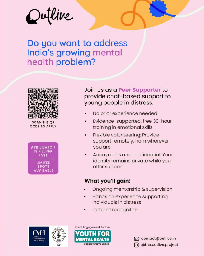 Outlive is a youth suicide prevention program led by the Centre for Mental Health Law & Policy, Indian Law Society and addresses urban youth suicides in India by engaging youth (aged 18-25) with experiences of suicide/self-harm, distress or mental health probl