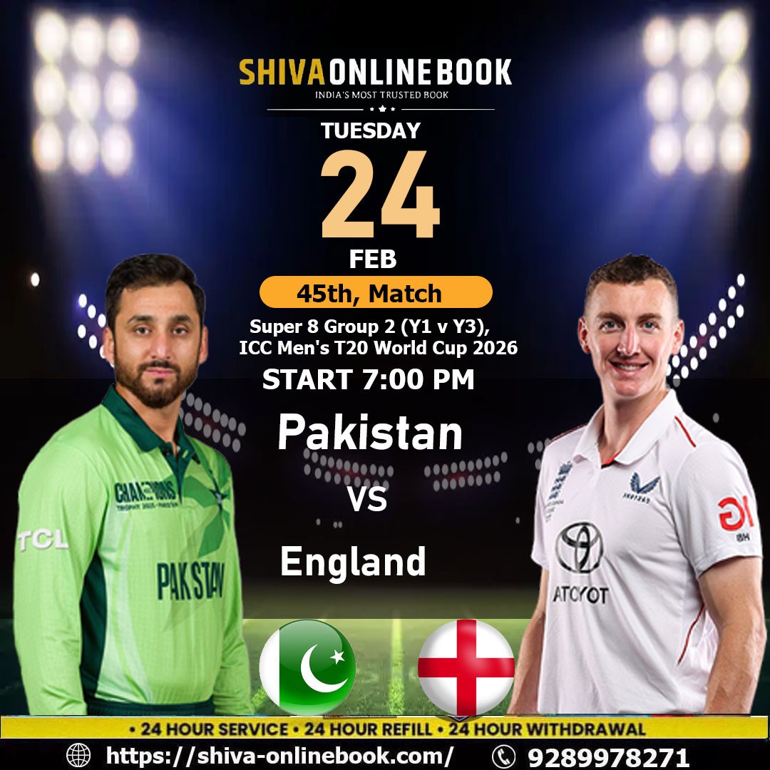 Shiva Online Book provides live match coverage and expert analysis of the 45th Match Super 8 Group 2 (Y1 v Y3) ICC Men's T20 World Cup 2026 match which features England national cricket team and Pakistan national cricket team at Pallekele International Cricket Stadium. This critical match which will begin at 7:00 PM today will determine which team gains semifinal momentum.